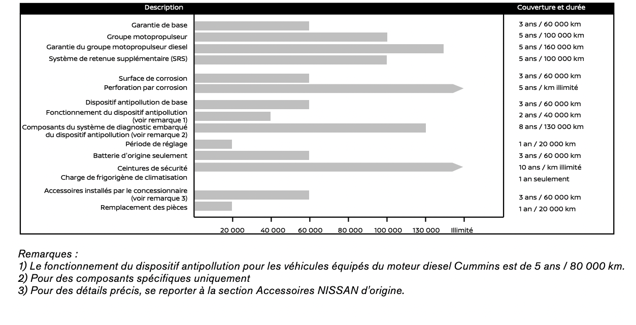 NISSAN CANADA INC., 5290 Orbitor Drive, Mississauga (Ontario) L4W 4Z5, garantit que toute pièce ou tout composant d'origine utilisés sur les véhicules neufs que NISSAN fournit seront, en cas de défaut de matériau ou de main-d'œuvre, réparés par un concessionnaire agréé NISSAN, ceci pendant la période de garantie et aux conditions stipulées dans le livret du propriétaire.