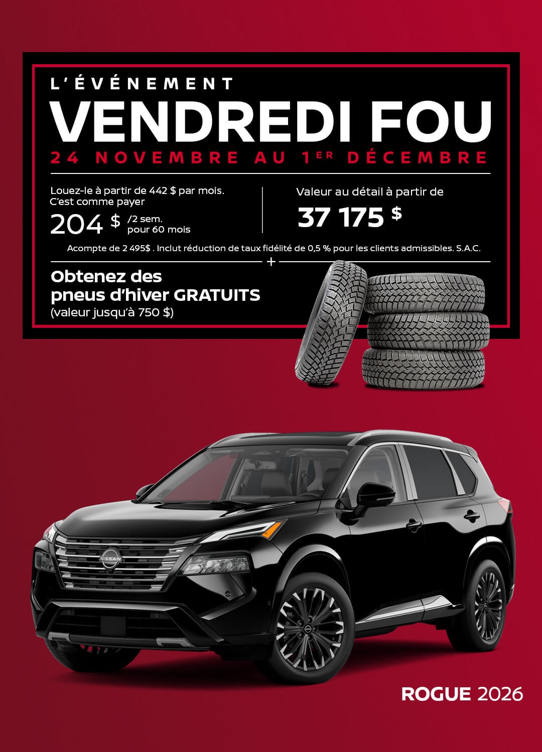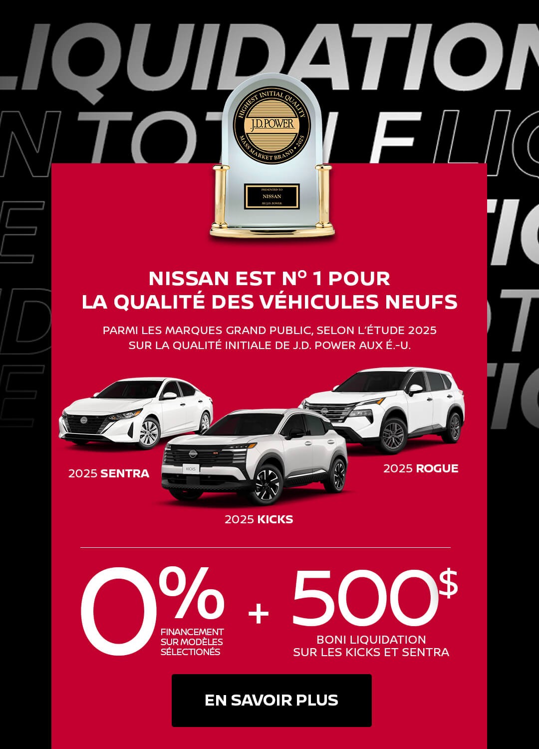 Que ce soit pour l’achat, la location ou l’entretien de votre véhicule, faites de bonnes affaires grâce à des offres spéciales, promotions et offres de financement Nissan flexibles. Notre concessionnaire Nissan s’engage à vous offrir une expérience unique et à vous accompagner à tous les stades. Notre équipe saura vous aider à trouver le véhicule parfait pour vous ou votre famille à Saint-Hyacinthe.